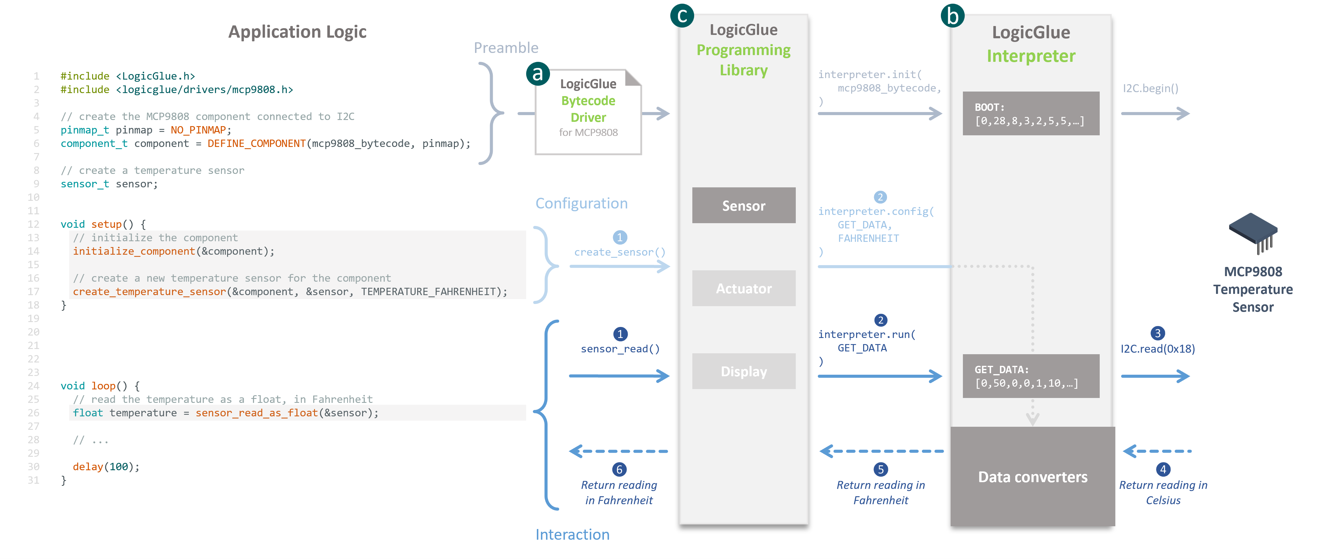 LogicGlue is a platform-independent driver system that decouples application logic from hardware specifics, enabling embedded programs to run across different microcontrollers without modification. It preserves native component features and protocols, simplifying prototyping while maintaining flexibility in hardware choice.