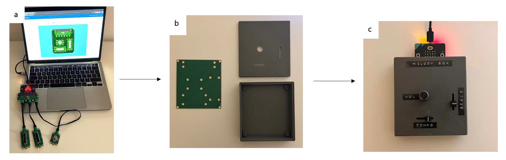 A web-based tool that leverages the Jacdac prototyping platform, enabling an end-to-end workflow from a wired desktop prototype to a robust, enclosed device with modules electrically connected via a carrier PCB.